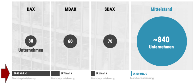 Betrachtet man die Unternehmensgröße, sieht man, dass Unternehmen im DAX durchschnittliche 40 Mrd. Unternehmensgröße aufweisen. Unternehmen im MDAX ca. 7 Mrd. Im SDAX durchschnittlich 2 Mrd. Und Unternehmen im Mittelstand 350 Mio. Also Faktor 5 Unterhalb des SDAX.