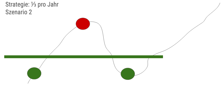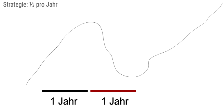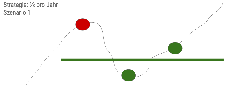 Wir kaufen ebenfalls drei Tranchen zu je 33.000 EUR. In Jahr 1 steigt der Markt noch ein weiteres Jahr. Wir kaufen an der Spitze Tranche 2. Und Tranche 3 am Boden. Auch hier ergibt sich ein zufriedenstellender Durchschnittspreis.