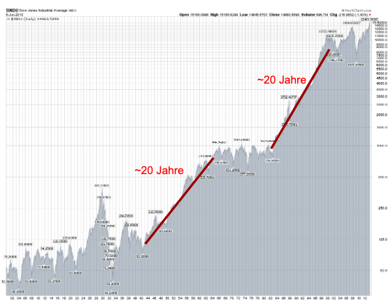 Abschließend vielleicht noch ein Chart, der Zeigt, dass es in 100 Jahren zweimal Phasen gab, in denen die Aktienkurse über 20 Jahre gestiegen sind.